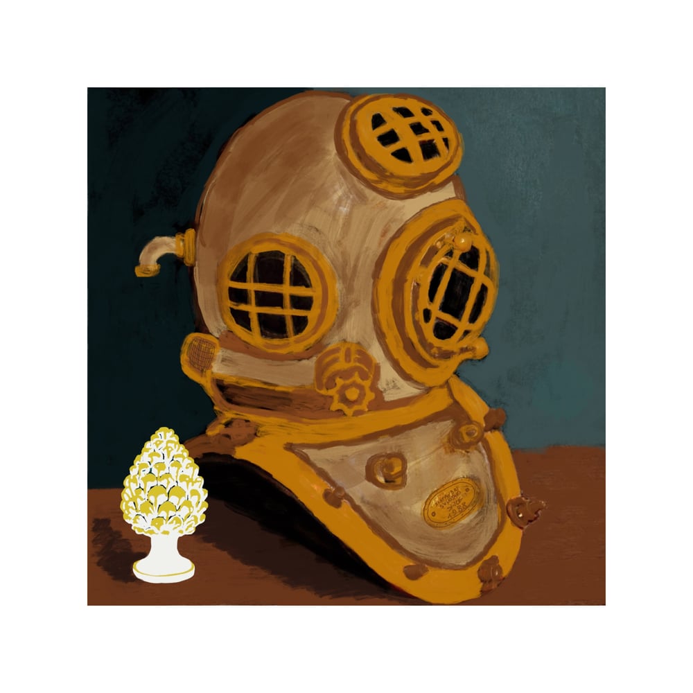Introspective work that analyzes the past and the future through two significant elements. The Sicilian pine cone refers to the roots, to a past to the memories that each of us carries with him and that condition our present and inevitably our future. The helmet of the diving suit represents the future or at least the path we have traced and decided to take. Those who always turn their gaze to the past risk entering into a depressive spiral while those who turn their gaze too far to the future risk paralyzing in anxiety. Pierre Hadot argued that the past no longer depends on us, as it is definitively ascertained, the future does not depend on us, since it is not yet: we must be indifferent to both. Only the present depends on us, it is the only thing that can be good or bad, because it is the only thing that depends on our will. This work invites you to reflect on your own existence and on living in the present.